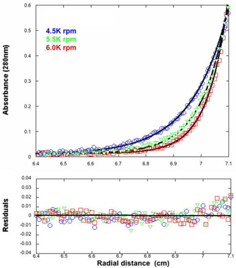 To determine the molecular weight of the assembly observed in the gel filtration and native gel electrophoresis, we carried out analytical ultracentrifugation measurements. Sedimentation equilibrium experiments were performed for multiple rotor speeds (Figure 3). The smooth curves overlying the data are simulations using the best fit parameters, resulting from a global NLLS with Mi and b as the fitting parameters. For the n-component system, the total concentration at radial position r, cr, is defined by Equation (2)
