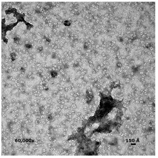 A continuous carbon-film copper grid (Electron Microscopy Sciences, Hatfield, PA, US) was plasma-cleaned for 30 s. A total of 3 µL of purified protein at 0.5 mg/mL was applied to the grid for 3 s and then blotted. A total of 3 µL of 1% uranyl acetate (aq) stain was applied three times and blotted after each application. Grids were imaged on a JEM 2100 microscope (JEOL Limited, Akishima, Tokyo, JP) equipped with a Gatan US4000 CCD camera (Gatan, Pleasanton, CA, USA).