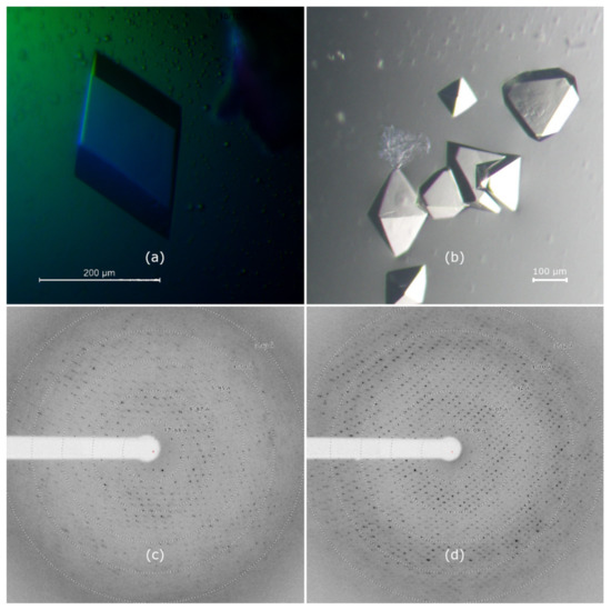 Crystals of gp11 grown under optimized conditions. (a) Crystal form A, grown in 1.6 M ammonium sulfate, 0.1 M trisodium citrate, and pH 5.7. Crystals are rhombohedral with a maximum edge length of 200 µm. (b) Crystals form B, grown in 1.0 M trisodium citrate, 0.1 M tris(hydroxymethyl)aminomethane (Tris), and pH 8.4. The truncated octahedron in the upper right measures approximately 150 µm × 150 µm × 50 µm. (c) Diffraction pattern for crystal form A, which indexed to space group P3x21. The resolution of the outermost ring is 3.63 Å. (d) Diffraction pattern for crystal form B, showing spots to ~2.8 Å, which indexed to P4x212. The resolution of the outermost ring is 3.32 Å.