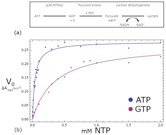 Nucleotide triphoshatase (NTPase) activities for gp11 were determined using a continuous coupled assay with the enzymes pyruvate kinase and lactate dehydrogenase. The reaction scheme involves uptake by pyruvate kinase of the NDP generated by the NTPase, and transfer of the phosphate group from phosphoenolpyruvate (PEP) to regenerate NTP and pyruvate. The released pyruvate is then taken by the enzyme lactate dehydrogenase, along with reduced nicotinamide adenine dinucleotide (NADH), to generate lactate and oxidized nicotinamide adenine dinucleotide (NAD+). The progression of the reaction is monitored by measuring the reduction in absorbance at 340nm as NADH is converted to NAD+. The reaction mixture contained 0.1 µM gp11, 10 U/mL rabbit muscle pyruvate kinase, 15 U/mL rabbit muscle lactate dehydrogenase, 2 mM PEP, and 0.3 mM NADH. Reactions were carried out in a 50 mM Tris pH 7.5, 72 mM KCl, and 7.2 mM MgSO4 (TKM) buffer, as first described in [42]; all reagents were purchased from Sigma Aldrich (St. Louis, MO, US). Data were analyzed as the simplest case described by the Michaelis–Menten equation, where NTP is rate limiting, and the steady-state rate of ATP hydrolysis, v, is given by Equation (1).