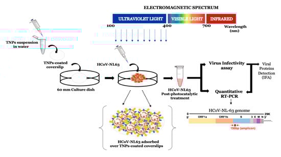 Schematic representation of the experimental set up utilized for the evaluation of photocatalytic inactivation of HCoV-NL63. TiO2 nanoparticles (TNPs) were prepared as a suspension in water and deposited on glass coverslips by drying at 60 °C for 4–5 h. An aliquot (100 µL) with calculated virions of HCoV-NL63 was placed on the TNP-coated coverslips and exposed to UV for indicated times. The TNP/UV-treated virus was then collected to determine the viral RNA stability and infectivity via quantitative RT-PCR, infectivity, and the detection of viral protein through immunofluorescence assay in HEK293L cells.