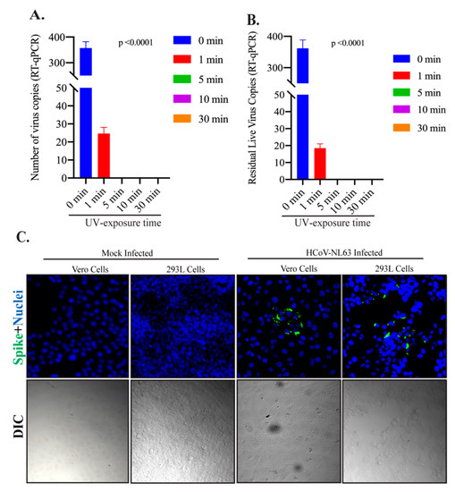 HCoV-NL63 virus (100 μL suspension) was applied onto the coverslip placed inside the wells of 12-well plate. The plate containing HCoV-NL63 viruses was exposed, after removing the lid, to the UV light inside a BSL-2 biological safety cabinet for 0, 1, 5, 10, and 30-min. UV-exposed virus was collected for the evaluation of virus inactivation by direct genomic RNA quantitation (RT-qPCR) and infectivity assay on HEK293L monolayer. Presence of the viral genomic RNA and its integrity was determined using qPCR as it was previously used for the detection of SARS-CoV-2 in environmental samples [13,22,23]. Genomic approaches are shown to be highly sensitive in detecting viral RNA and multiple targets are used for generating PCR amplicon [13,24]. Importantly, detection of genomic RNA through RT-qPCR does not constitute for the presence of an ‘infectious’ virus but shows the presence of viral genomic RNA. Therefore, a virus infectivity assay must be performed for the detection of any infectious virus. However, if there isn’t detection of intact viral genomic RNA, in samples after treatment/exposure, it can be concluded that virus has been completely eliminated. Any region of the viral genome can be used for detecting genome integrity and for our assays, we selected Spike protein, involved in attaching the virus to host cells [25], because of its high sensitivity and specificity for the detection of viral genomic RNA. HCoV-NL63 viral copies were calculated using standard curve generated on the basis of serial dilutions of known HCoV-NL63 genomic RNA. Expectedly, the copies of intact viral genomic RNA declined with UV-exposure (Figure 2A). Importantly, we saw an efficient reduction in the number of intact viral genomic RNA even at 1 min exposure to the UV-light. However, there were some intact genomic RNA of HCoV-NL63, at least in the region (spike protein), while other genomic regions may have been fragmented (to make the virus inactive) but increasing the exposure time to 5, 10, and 30 min completely degraded the genomic RNA of HCoV-NL63, below the detection limit, confirming total disintegration of the virus (Figure 2A). Since, RT-qPCR analyzes the viral genome, not the infectiousness, we asked whether treatment with UV can reduce the infectivity of HCoV-NL63 virus. To this end, UV exposed HCoV-NL63 viruses were added onto the monolayer of HEK293L for 2 h to facilitate attachment and entry of the residual infectious virus. The permissive nature of HEK293L cells were evaluated, before using them for the estimation of residual live virus, by adding same amounts of HCoV-NL63 on Vero E6 or HEK293L cells and allowing them to grow for 48 h after removing the unattached virus. Infection and replication of HCoV-NL63 virus in these cells were detected by localizing viral spike glycoprotein through Immunofluorescence assay. Detection of similar, if not better, amounts of viral protein staining in HEK293L cells confirmed them to be permissive for HCoV-NL63 infection. A representative image is shown in Figure 2C. Localization of viral proteins in the cells are used for infectivity assays but detection of intracellular viral genomic copies, following infection, can also be used for indirect quantitation of infectious virus besides gold standard assays (plaque assay). For our assay, total RNA collected at 48 hpi (hour post infection) was used for the detection of HCoV-NL63 genomic RNA, to measure the levels of residual live virus in UV exposed samples (Figure 2B). Our data showed that samples exposed to UV for 5-min or longer did not have any intracellular HCoV-NL63 genome suggesting total inactivation of the virus (Figure 2B). However, samples exposed to UV for 1min showed some levels of intracellular viral genomic RNA, suggesting few but very minimal levels of residual live virus, which entered and replicated in these cells. UV-untreated samples, which showed significant copies of intracellular genomic RNA (Figure 2B, 0 min), was used as a reference for estimating the levels of residual live virus.