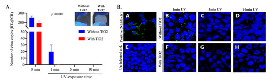Next, we sought to determine whether the photocatalytic activity of TNPs can facilitate/enhance the efficacy of virus inactivation. In order to do that, we exposed HCoV-NL63 virus with UV deposited on a surfaces coated with TNPs, which was achieved by depositing nanosized TNPs (600 μL) onto the coverslip (2.5 cm2 surface area) (Figure 1). HCoV-NL63 coronavirus (100 μL) was applied onto TNPs-coated and uncoated (control) coverslips, placed inside the wells of a 12-well plate and exposed to the UV light for indicated times. Total RNA was extracted by directly adding the Trizol onto the coverslip for quantifying the intact genomic HCoV-NL63 RNA copies through RT-qPCR, as described above. Expectedly, the viral copies quantified through RT-qPCR for viral genome fragmentation showed significantly reduced copies (almost to the background level) of HCoV-NL63 from the TNP-coated surface as compared to the control (uncoated surface) even at 1-min of UV-exposure (Figure 3A).