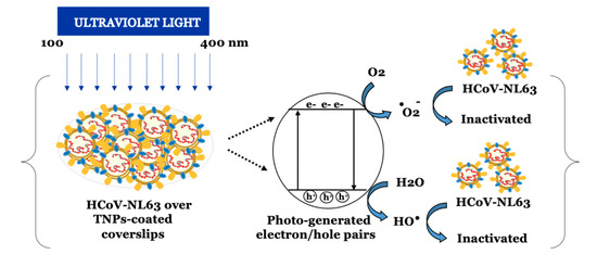 A presumed model to understand the underlying mechanism involved in the photocatalytic inactivation of HCoV-NL63 has been described in Figure 6. In the presence of UV radiation, TiO2 nanoparticles act as photocatalyst due to their specific energy structure. UV-irradiation of nanosized TiO2 results in the excitation of electron leading to the formation of a specific “electron-hole (e−-h+)” pair and generation of reactive oxygen species (ROS). The electron holes (h+) catalyze oxidation processes and convert water/hydroxide molecules to peroxide/hydroxyl radicals, whereas electrons (e−) induce reduction reactions and react with molecular oxygen to generate superoxide radicals.