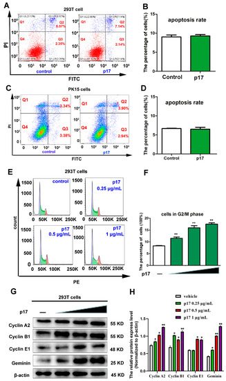 Effects of p17 on cell apoptosis and cell cycle progression. (A–D) The effects of p17 on cell apoptosis in 293T and PK15 cells. The effects of p17 on cell apoptosis were analyzed using Annexin V-FITC/PI staining followed by flow cytometry. Control groups were transfected with empty plasmid for 24 h. P17 groups were transfected with FLAG-p17 plasmid (1 μg/mL) for 24 h. (E,F) The effect of p17 on cell cycle distribution in 293T cells. The cell cycle distribution was analyzed using PI/RNase staining followed by flow cytometry. Control groups were transfected with empty plasmid for 24 h. The FLAG-p17 plasmids for transfection were 0.25, 0.5, and 1 μg/mL, respectively, for 24 h. (G) Effect of p17 on the expressions of cell cycle regulatory proteins, including Cyclin A2, Cyclin B1, Cyclin E1, and Geminin. The FLAG-p17 plasmids for transfection were 0.25, 0.5, and 1 μg/mL for 24 h, respectively. (H) The intensity of the western blot bands was quantified by densitometric analysis. Values represent the mean ± S.D; * p < 0.05, ** p < 0.01 versus the control groups.
