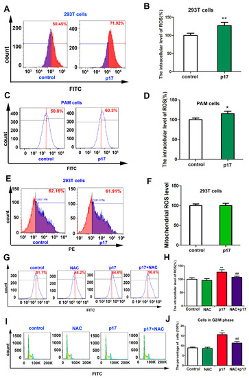 In order to determine the underlying molecular events of p17-induced cell cycle arrest, the intracellular and mitochondrial levels of ROS were analyzed using flow cytometry. As shown in Figure 3A–D, compared with control groups, the intracellular levels of ROS in both 293T and PAM cells transfected with p17 gene were significantly increased (p < 0.01 and p < 0.05). However, compared to control group, the level of ROS in mitochondria did not exhibit significant change upon p17 expression in 293T cells (Figure 3E,F). Then, we examined whether intracellular ROS was involved in the process of p17-induced cell cycle arrest. As shown in the Figure 3G,H, the antioxidant N-acetyl-L-cysteine (NAC) was used, which could alleviate the overproduction of ROS induced by p17 expression. Treatment with NAC could partially reverse the cell cycle arrest induced by p17 (Figure 3I,J). These data suggest that the overproduction of ROS was involved in the process of p17-induced cell cycle arrest.