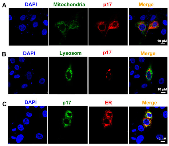 To explore the mechanisms of p17-induced the production of ROS, the subcellular localization of p17 in PAM cells was determined by confocal microscopy. The results showed that p17 protein was co-localized with the KDEL ER retention RFP marker, but not with the mitochondria-targeting EGFP marker and lysosome LAMP1-GFP marker (Figure 4A–C).