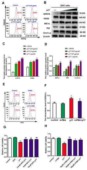 P17 could induce ER stress, and ER stress was responsible for the p17-inhibited cell proliferation. (A) The effect of p17 on the level of intracellular Ca2+ was analyzed using Fluo-3 AM staining followed by flow cytometry. P17 groups were transfected with FLAG-p17 plasmids (0.25, 0.5, and 1 μg/mL) for 24 h. (B) The effect of p17 on the expressions of GPR78, PERK, IRE1α, PDI, and Ero1-Lα. P17 groups were transfected with FLAG-p17 plasmids (0.25, 0.5, and 1 μg/mL) for 24 h. (C,D) The intensity of the western blot bands was quantified by densitometric analysis. (E,F) 4-PBA pre-treatment could decrease the production of ROS by p17. 293T cells were pretreated with 4-PBA (20 μM) for 30 min, and then transfected with p17 gene in the presence of 4-PBA for another 24 h. (G) The role of ROS in the decrease of cell proliferation induced by p17 was analyzed by using the CCK8 assay. Using NAC (2.5 mM) to alleviate the production of ROS could reverse the decrease of cell proliferation induced by p17 in 293T cells. 293T cells were pretreated with NAC for 30 min, and then transfected with P17 gene in the presence of 4-PBA for another 24 h. (H) The role of ER stress in the decrease of cell proliferation induced by p17 was analyzed by using the CCK8 assay. Using 4-PBA (20 μM) to alleviate ER stress could also prevent the cell proliferation decrease induced by p17. Control groups were transfecting with empty plasmids. Values represent the mean ± SD; * p < 0.05, ** p < 0.01 versus control groups; # p < 0.05, ## p < 0.01 versus p17 groups.