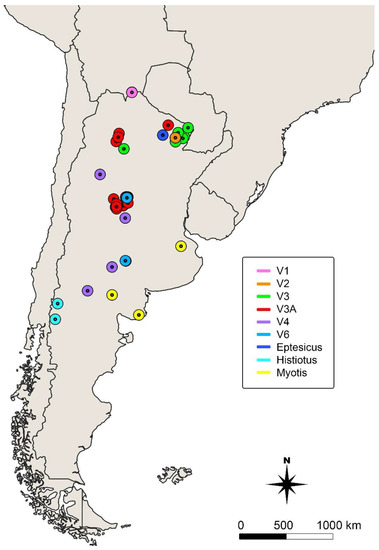 - Piñero, C.; Dohmen, F.G.; Beltran, F.; Martinez, L.; Novaro, L.; Russo, S.; Palacios, G.; Cisterna, D.M. High diversity of rabies viruses associated with insectivorous bats in Argentina: Presence of several independent enzootics. PLoS Negl. Trop. Dis. 2012, 6, e1635. [Google Scholar] [CrossRef] [PubMed]