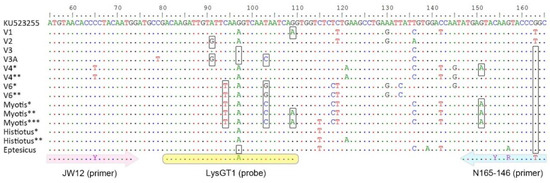 Twelve out of 18 samples typed as terrestrial and non-vampire-bat variants were positive by the LysGT1 assay (Figure 2, Table 2). Terrestrial variants V1 and V2 were detected in all cases and depict only one mismatch with respect to the probe sequence (Figure 3, Table 2). The most frequent variant circulating in Argentina is V4 which belongs to the widespread bat Tadarida brasiliensis. This variant was successfully amplified and detected by qRT-PCR in the four individuals analyzed, one of them showing two mismatches in the region comprising primer N165-146, while the remaining having one mismatch (Figure 3, Table 2). The variant circulating among bats of the genus Histiotus was also positively diagnosed by this method, both samples depicting 1 mismatch in the region of primer N165-146. In contrast, the variant circulating in Lasiurus and Dasypterus (V6) was negatively diagnosed. The two samples showed three mismatches: two in the probe region and one in the primer N165-146. The three Myotis samples were also undetected and depicted the highest levels of variation in the region delimited by primers JW12 and N165-146, showing two and three mismatches in the probe region and two mismatches in the region corresponding to primer N165-146. One of the two samples typed as Eptesicus was positive by qRT-PCR, while the other did not produce detectable amplification by this method. We could only obtain a good quality sequence of the region encompassing the qRT-PCR oligos in the positively diagnosed sample, which showed two total mismatches, one in the probe region and one with respect to primer N165-146.