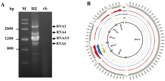 Electrophoresis analysis of RT-PCR products of the genomic RNA segments of jujube yellow mottle-associated virus (JYMaV) in the sample HZ by using the primer set 3C/5H (A) and profile distribution of sRNA reads of isolate HZ and RNA reads of two isolates AKS-6 and AKS-15 along genomic RNAs 1–6 of JYMaV-HZ (B). ck-, a leaf sample of a healthy jujube plant from Hubei Province. M, DNA marker Ⅲ. ORF in each RNA segment of JYMaV was shown by using a grey line above the read depth graphic in panel B.