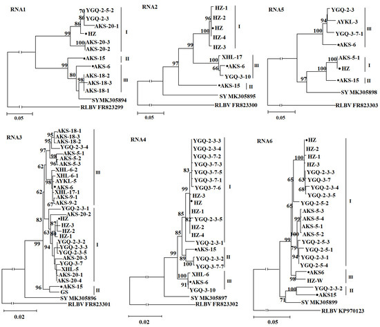 Unrooted neighbor joining (NJ) phylogenetic trees generated from the nucleotide sequences of RNAs 1–6 of jujube yellow mottle-associated virus (JYMaV). In the RNA1-based tree, fragments (525–1619 nt at 3′ end of RNA1) obtained from samples AKS18, AKS20, YGQ-2-3 and YGQ-2-5 by RT-PCR using primer set 5H/3C were included in the assay. The sequence of reported isolate SY in each tree was marked by its isolate name followed by a GenBank accession number. Three JYMaV isolates determined by high throughput sequencing were highlighted by black dots. The corresponding RNA sequence of raspberry leaf blotch virus (RLBV) was used as an outgroup in each phylogenetic tree.