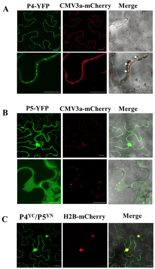 Subcellular localization (A,B) and bimolecular fluorescence (BiFC) (C) assays of P4 and P5 of jujube yellow mottle-associated virus (JYMaV) in epidermal cells of wild-type Nicotiana benthamiana leaves. The fusion proteins CMV3a-mCherry and H2B-mCherry were used as plasmodesmata and nucleus markers, respectively. Colocalization dots of JYMaV-P4 with CMV3a-mCherry at PD were indicated by arrow heads. Images were acquired 3 days after agroinfiltration under a confocal microscope at 63x/1.20 WATER objective. Scale bar = 20 μm.
