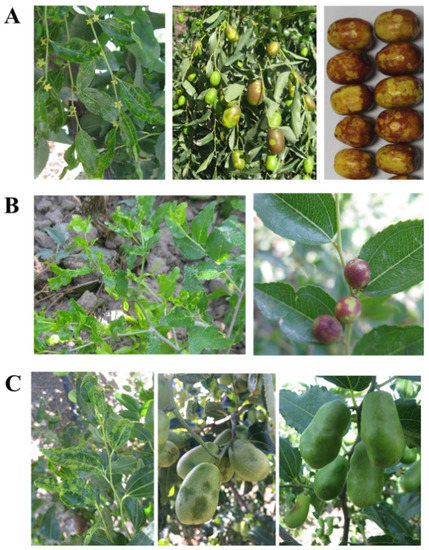Disease symptoms on leaves and fruits of Ziziphus jujube cv. ‘Huizao’ (A), Z. jujuba var. ‘spinosa’ (B) and Z. jujuba cv. ‘Junzao’ (C).