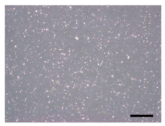 To develop a proxy in vitro model for VHSV infection, primary IECs from healthy juvenile olive flounder (<15 g) were isolated and cultured using a protocol modified from a previous study []. First, intestinal tissues were dissected and put in a solution containing antibiotics (gentamicin, Gibco, ThermoFisher Scientific, Waltham, MA, USA, 10 mg/mL; penicillin-Streptomycin (PEST), Gibco, 10,000 U/mL) and an antifungal (amphotericin B, Gibco, 250 µg/mL). Blood clots in the intestinal tissues were removed followed by trypsinization in 0.5% trypsin–EDTA (Gibco) for 20 min. The trypsin activity was stopped by adding 10% fetal bovine serum (FBS; Gibco) to the phosphate-buffered saline (PBS). IECs were collected and seeded in cell culture flasks in the Gibco Leibovitz’s L-15 Medium (Gibco) containing 10% FBS and 1% of gentamicin and PEST. Thereafter, the flasks were incubated at 20 °C for 24 h. After 24 h, the suspended particles and blood cells in the cell culture medium were removed by washing twice using PBS. The cell culture medium was replaced every second day and the cells were incubated at 20 °C until confluent.