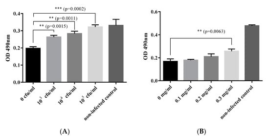 Wang et al. [] showed that B. subtilis OKB105 and surfactin effectively inhibited TGEV from entering porcine intestinal epithelial cells (IPEC-J2) in a dose-dependent manner. Similarly, Vollenbroich et al. [] showed concentration-dependent inhibition of SHV-1, HSV-1, HSV-2, VSV, SIV, and SFV cultured in different cell lines. They found that the inactivation rate increased logarithmically in a linear trend that corresponded with the increase of the surfactin concentration. They noted that doubling the concentration from 25 to 50 µM resulted in an increase of the inactivation rate by a factor of 1.4 for some viruses []. In the present study, we found a significant high correlation (r2 = 0.973, p < 0.001) between the inhibition of VHSV and the increasing concentration of B. subtilis treatment in IECs. However, surfactin only showed significant inhibition of VHSV in IECs at a concentration of 0.3 mg/mL. Taken together, these findings show that B. subtilis and surfactin have antiviral properties capable of inhibiting VHSV and other viruses infecting different host species [,].