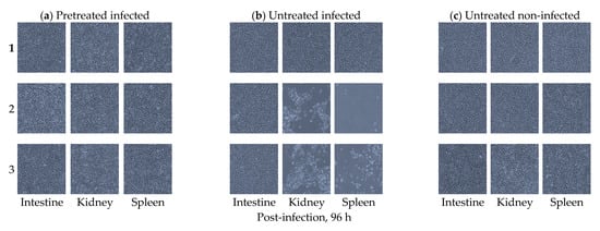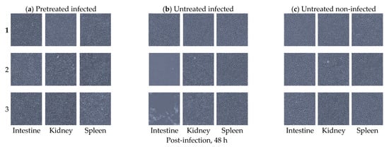 EPC cells inoculated with intestine, kidney, or spleen tissue homogenates from olive flounder (Paralichthys olivaceus). (a) Replicates of intestine, kidney, and spleen tissue homogenates cultured in EPC cells. Homogenates are from the orally B. subtilis-pretreated olive flounder at a concentration of 106 CFU/mL examined 48 h after the VHSV infection. Note the absence of cytopathic effects (CPE) in all the tissues examined. (b) Replicates of intestine, kidney, and spleen tissue homogenates cultured in EPC cells. Homogenates are from B. subtilis-untreated olive flounder examined 48 h after the VHSV infection. Note the presence of CPE in two samples of the intestines and absence of CPE in the spleen and kidney replicates. (c) Replicates of intestine, kidney, and spleen homogenate tissues cultured in EPC cells from B. subtilis-untreated olive flounder that were not infected by VHSV examined after 48 h. Note the absence of CPE in all the tissues examined. All images were visualized by phase-contrast microscopy at 100× magnification.