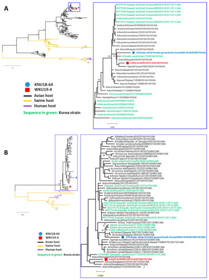 Hypothesis for the ancestor of each gene segment evolution of KNU18-64 (A/Greater white-fronted goose/South Korea/KNU18-64/2018(H1N1)) (A) and WKU19-4 (A/wild bird/South Korea/WKU19-4/2019(H1N1)) (B) strains.