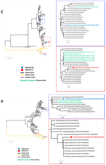 We carried out phylogenic analyses of the eight genes from both viral strains to assess their genetic relationships with those of domestic poultry and wild birds in Korea and neighboring countries using data from the NCBI and GISAID with selected sequence with more than 99% and 90% of query cover and identity, respectively. The results revealed that eight genes (PB2, PB1, PA, HA, NP, NA, M, and NS) in our H1N1 strains were distributed in East Asian lineages and a North American avian lineage. The phylogenetic data revealed that the H1N1 influenza strains investigated in the present study are of avian origin, and are phylogenetically distant from the H1N1 swine virus and the human-infecting strain. This substantial divergence from the swine- and human-infecting strains is demonstrated in Figure 2 by the sizable distance between the novel isolates (represented by black branches) and the swine strain (yellow branches) and human-infecting strain (purple branches).
