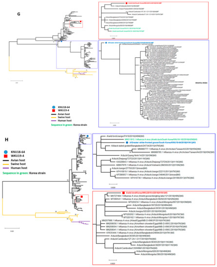Phylogenetic trees based on the nucleotide sequences of HA (A), NA (B), PB2 (C), PB1 (D), NP (E), PA (F), MP (G), and NS (H). The trees were generated by the neighbor-joining method using MEGA 6.0 software with bootstrap replication (1000 bootstrap iterations). The KNU18-64 strain (A/Greater white-fronted goose/South Korea/KNU18-64/2018(H1N1)) is indicated by blue circles and the WKU19-4 strain (A/wild bird/South Korea/WKU19-4/2019(H1N1)) is indicated by red boxes. The avian, swine, and human hosts are represented in black, orange, and purple, respectively. The Korean strains are shown in green.