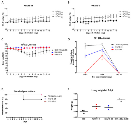 Pathogenicity of the two H1N1 isolates in vivo. For each isolate, BALB/c mice were intranasally infected with different EID50 concentrations of the virus (104, 105, and 106 EID50/mouse). Changes to the weights of the mice are shown for KNU18-64 (A) and WKU18-4 (B), and the survival rates were noted. The BALB/c mice were intranasally challenged with 105 EID50 of each virus, and a H1N1 (2009) strain isolated from humans (CA/04/09(pdm09)) was used as a control virus. Weights of the mice (C); virus titers in the lung (D); survival rates (E); mean of lung weights (F) (n = 3); Body weights are presented as percentages of the original weight (n = 5).