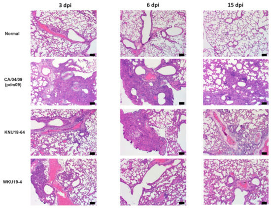 Histology of lung inflammation determined by hematoxylin and eosin (H&E) staining. For each isolate, BALB/c mice were intranasal infected with EID50 concentrations of the virus at 105 EID50/mouse. The uninfected control (normal); CA/04/09(pdm09) (H1N1)-, KNU18-64 (H1N1)-, and WKU19-4 (H1N1)-infected mouse lungs were collected and stained with hematoxylin and eosin (H&E) at 3, 6, and 15 days post-infection (dpi) (scale bar, 100 µm; original magnification × 100).