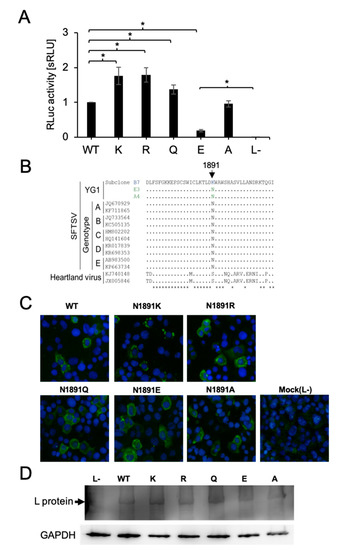 Noda, K.; Tsuda, Y.; Kozawa, F.; Igarashi, M.; Shimizu, K.; Arikawa, J.; Yoshimatsu, K. The Polarity of an Amino Acid at Position 1891 of Severe Fever with Thrombocytopenia Syndrome Virus L Protein Is Critical for the Polymerase Activity. Viruses 2021, 13, 33. https://doi.org/10.3390/v13010033