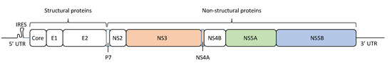 The HCV particle has a diameter of approximately 68 nm (range: 45–86 nm) [12], and contains a linear positive-sense single-stranded RNA genome encoding 10 viral proteins (Figure 1) [13]. The HCV RNA genome has a length of ~9.6 kb, including a single open reading frame and flanking 5′ and 3′ untranslated regions (UTRs), with a specific structure for viral RNA replication and translation. The 5’-UTR contains the internal ribosome entry site (IRES), from which begins the translation of a polyprotein of ~3000 amino acids. This polyprotein is cleaved by both cellular and viral proteases. Cellular proteases cleave the HCV polyprotein into three structural proteins: core, E1, and E2 [14]. On the other hand, the virus-encoded proteases NS2 and NS3/4A cleave the HCV polyprotein into seven non-structural (NS) proteins: p7, NS2, NS3, NS4A, NS4B, NS5A, and NS5B [14]. The NS5B protein is an RNA-dependent RNA polymerase (RdRP), which synthesizes and replicates viral RNA to produce new viral genomes that are incorporated into the virus particles. HCV NS5B RdRP lacks proofreading activity, resulting in a high error rate during HCV replication, which promotes HCV genetic heterogeneity and population complexity.
