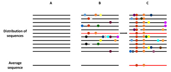 Schematic representation of the genome composition of a virus population. Viral genomes are represented as horizontal lines, and mutations as symbols in the lines. (A) A homogeneous virus population in which no mutations are generated, such that all genomes within this population are identical. (B) A heterogeneous virus population in which mutants are generated at a high frequency, such that most of the genomes are genetically different. However, the average consensus sequence of this population is identical to in the homogeneous population (A). (C) The selection of an individual genome (marked in red), via random drift or positive selection, generates a new distribution of variants if the replication system produces new mutations. Now, the average population genome sequence is different from that shown in panels (A,B).