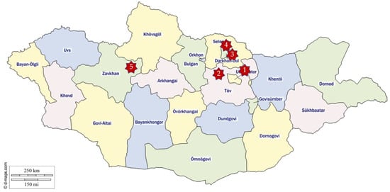In this map of Mongolia, the sampling sites are indicated with red stars. Sampling site 1 was in the aimag TOV, sum Erdene. Sampling site 2 in the aimag TOV as well, but in the sum Ugtaal. The sampling site 3 was in the aimag Darkhan-Uul, sum Shariin Gol; sampling site 4 in the aimag Selenge, sum Javkhlant; and sampling site 5 was in the aimag Zavkhan, sum Tosontsengel. The map was taken from [].