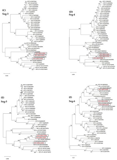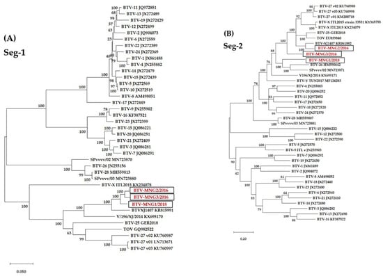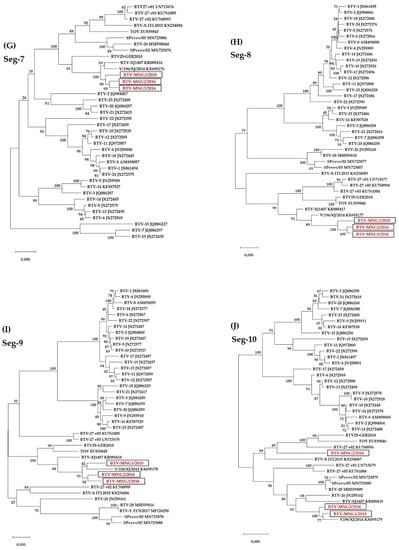 Phylogenetic analyses of the genome of the three Mongolian strains. The phylogenetic trees of each of the 10 segments were created with MegaX using the genetic distinction model Tamura–Nei and tree-built method Maximum likelihood including BTV strains representing the published BTV serotypes. We performed a bootstrap analysis with 100 replications. The black boxes surround the BTV-MNG1/2018, BTV-MNG2/2016 and BTV-MNG3/2016 sequences highlighted in red. Subfigure (A) shows Seg-1, (B) Seg-2, (C) Seg-3, (D) Seg-4, (E) Seg-5, (F) Seg-6, (G) Seg-7, (H) Seg-8, (I) Seg-9 and (J) Seg-10.