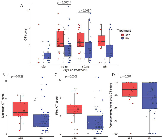 IFN- or ARB-treated patient CT scores were batched based on the elapsed time from treatment (Figure 2A). The timing of CT scans relative to the start of treatment was not consistent for all patients, as the attending clinician requested CT scans for each patient when the patient’s clinical status suggested worsening or improvements in the respiratory status. Refer to Supplementary Figure S2 for time-course plots of CT scans for all patients. Despite there being a limited number of CT scans immediately prior to the onset of treatment, most notably in those patients who went on to receive ARB alone, all COVID-19 patients exhibited comparable CT scores, on average <2.0. Indeed, if CT images on day 1 of treatment were included for baseline consideration, again there were no statistically significant differences in the CT scores (Supplementary Figure S3). On day 1 of treatment, one would not anticipate a treatment effect on lung abnormalities. Refer to Supplementary Figure S1 for representative CT images and scores. The CT scores were significantly different over the disease course for patients who received IFN compared with those of patients who did not. Specifically, average CT scores remained low in IFN-α2b-treated patients compared with those of ARB-treated patients, whose average CT scores were consistently higher, up to at least 20 days following treatment. In addition, IFN-α2b-treated patients had significantly lower peak CT scores compared to ARB-treated COVID-19 patients (Figure 2B), and their final CT scores prior to discharge were significantly lower for IFN-treated patients in comparison to the ARB-treated group (Figure 2C). This finding was further supported by a trend of greater reduction from the peak CT score observed for IFN-treated patients versus those treated with ARB (Figure 2D).