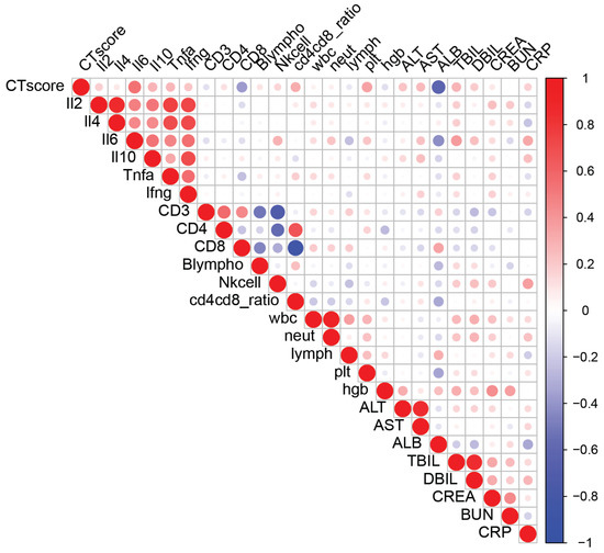 Lung CT image abnormalities correlate with many clinically relevant biomarkers of COVID-19 severity. Spearman’s correlation coefficients were calculated between blood-based biomarkers measured and CT scores. Blue-to-red heat map and dot sizes identify levels of correlation. Interleukin (IL)2, IL-2; IL4, IL-4; IL6, IL-6; IL10, IL-10; Tnfa, TNF-α; Ifng, IFN-γ; Blympho, B lymphocytes; Nkcell, NK cells; wbc, white blood cells; neut, neutrophils; lymph, lymphocytes; plt, platelets; hgb, hemoglobin; ALT, alanine transaminase; AST, aspartate aminotransferase; ALB, albumin; TBIL, total-value bilirubin; DBIL, direct bilirubin; CREA, creatinine; BUN, blood urea nitrogen; CRP, C-reactive protein.