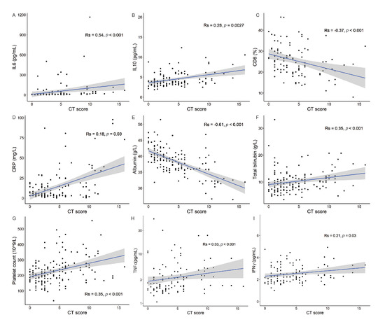 The severity of lung abnormalities is associated with specific immune and clinical biomarkers. Scatterplots depicting associations between CT scores and various blood-based biomarkers. Spearman’s correlation coefficients were calculated between CT scores and (A) IL-6, (B) IL-10, (C) CD8+ T cells, (D) CRP, (E) albumin, (F) total bilirubin, (G) platelets, (H) TNF-α, and (I) IFN-γ, as indicated. Shaded areas indicate 95% confidence intervals.