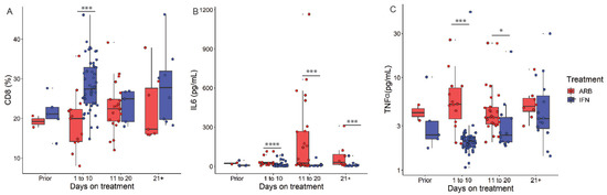 We next examined the effects of IFN treatment on the identified predictors of worsening lung abnormalities. We considered only those biochemical or immune cell populations whose levels prior to the onset of treatment were the same in all patients. The data in Figure 5 revealed that IFN treatment prevented virus-induced reductions in CD8+ T cells and confirmed our earlier findings of IFN treatment reducing the levels of IL-6 [5]. We also provide evidence that IFN treatment limited virus-induced increases in TNF-α levels.