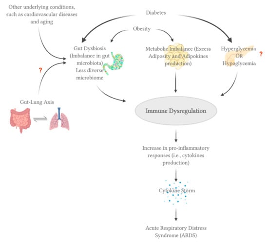 Obesity is a global epidemic that causes a low-grade chronic inflammation, affecting the immune system. The effects include immune response dysfunction, gut microbiome/virome imbalance, pro-inflammatory responses and antiviral immunity reduction []. A case control study in Mexico has found that obesity predisposes COVID-19 with the strongest association, followed by diabetes and hypertension []. In terms of severity, a study of 30 COVID-19 subjects has reported that patients with a higher BMI (Body Mass Index) experienced more severe symptoms in comparison to those with lower BMI (27.0 ± 2.5 vs. 22.0 ± 21.3) []. Excess adiposity caused by obesity may lead to various chronic diseases such as diabetes and hypertension []. These obesogenic comorbidities affect the renin–angiotensin system resulting in metabolic imbalance and excess pro-inflammatory response []; as a consequence, obese patients with COVID-19 may experience severe symptoms. Obesity is also associated with dysregulation in the production of adipokines (i.e., cytokines secreted by adipose tissue) []. For instance, serum amyloid-A acts directly on macrophages, facilitating the increase in inflammatory cytokines secretion, including IL-6 [], which is an important component of the cytokine storm; commonly observed in severely ill COVID-19 patients. Collectively, these data suggest a possible mechanism in which obesity may influence COVID-19′s clinical severity.