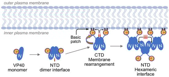 This cartoon schematic illustrates EBOV VP40–VP40 interaction phases crucial for viral particle formation: (i) VP40 NTD homodimers are formed. Once at the plasma membrane, VP40 rearrangement occurs through (ii) a basic patch containing six lysine residues. This rearrangement triggers exposure of (iii) an NTD surface that interacts at the hexameric interface between VP40 molecules necessary to form the viral matrix.