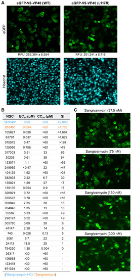 EBOV VP40 membrane localization is disrupted by sangivamycin. (A) Disruption of VP40 membrane association via the introduction of the L117R mutation (VP40 L117R positive control). Relative fluorescence units (RFUs) are shown below the eGFP images at 10× magnification. Lower RFU values for hits were then phenotypically confirmed via VP40 membrane association and fluorescent cellular rings for VP40 WT (top left panel). VP40 L117R positive control prevents initial VP40 dimerization and virion-like particle (VLP) formation leading to diffuse cellular fluorescence with lower RFU (top right panel). Hoechst 33342 DNA staining for chromatin in nuclei was used as an initial indicator of cell health (bottom panels). (B) The table lists the top 30 hits by their NCI assigned NSC numbers. Sangivamycin as either its HCl salt (NSC 143648) or free base (NSC 65346) impairs EBOV VP40 localization to the inner plasma membrane. Listed are the half maximal effective concentration (EC50), drug concentration required to reduce cell viability by 50% (CC50), and selectivity index (SI) values of the 30 hits identified in the primary screening and evaluated in the secondary screening. EC50 values were quantified by plate reads compared to VP40 WT and VP40 L117R positive control values. CC50 values were measured with CellTiter-Glo as relative luciferase units compared to VP40 WT and VP40 L117R positive control and SI was calculated by CC50/EC50. Although initial quantification was performed by plate reader, all hits were confirmed by a phenotypic shift from fluorescent rings to homogenous expression by cellular imaging. (C) Representative fluorescent images of VP40 WT treated with 37.5, 75, 150, and 300 nM sangivamycin at 10× magnification.