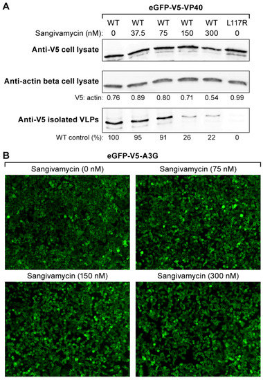 Sangivamycin reduced the recovery of V5-tagged VP40 as secreted VLPs in a dose-dependent manner. The reduction in VLPs released from treated cells at and above 150 nM (Figure 3A, bottom) was consistent with the reduction in eGFP-V5-VP40 inner membrane localization observed at the same sangivamycin concentrations (Figure 2C). As expected, cell culture supernatants from cells transfected with plasmid encoding VP40 L117R positive control did not contain detectable V5-tagged VP40, indicating that VLPs had not been released (Figure 3A, bottom right).
