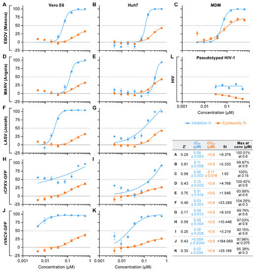 The infectious virus cell-based screening was performed as described previously [39]. Vero E6 cells were used to test small-molecule viral inhibitors of multiple and taxonomically distinct viruses. All viruses were grown at 37 °C and 5% CO2: