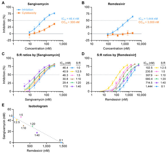 Treatment with sangivamycin yielded a measurable dose-dependent reduction in luciferase expression. Luciferase activity (expression) reduced greater than 80% of the activity quantified in untreated control cells at 24 h with an IC50 of 46.4 nM (Figure 5A). At the highest dose and 24 h post-exposure, dose-dependent cytotoxicity of sangivamycin was approximately 30%. Minigenome activity was also tested with remdesivir, which specifically targets EBOV L activity [57]. As expected, remdesivir was active in the minigenome assay, albeit with an IC50 of 1444 nM (Figure 5B). Because both remdesivir and sangivamycin are nucleoside analogs, we tested them in combination at several constant ratios relative to their respective IC50 values to determine whether they are synergistic, additive, or antagonistic against the EBOV L target. Increasing amounts of remdesivir relative to sangivamycin (Figure 5C) or increasing amounts of sangivamycin relative to remdesivir (Figure 5D) both lowered the IC50 of the respective treatments. These IC50 values were plotted for each constant ratio of sangivamycin to remdesivir (S:R) in an isobologram [58]. A straight line between the IC50 for sangivamycin alone (46.4 nM) on the y axis to the IC50 for remdesivir alone (1444 nM) on the x axis determined the additive line (Figure 5E, dotted line). IC50 values for the constant ratios of S:R were plotted along the additive line (Figure 5E). The results suggest that both compounds are acting on the same target and not affecting the activity of each other. IC50 values for the constant ratios significantly above the additive line would indicate that the compounds were antagonistic to each other in targeting EBOV L activity. On the other hand, if they were acting on different targets to affect the minigenome assay (e.g., a cellular target that indirectly affects the minigenome readout), then the combined treatment would have resulted in data that plotted below the additive line indicative of synergy.