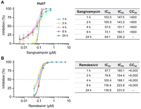 Sangivamycin inhibits EBOV up to 24 h after addition relative to virus exposure. Huh7 cells were infected with EBOV and sangivamycin (A) or remdesivir (B) were added to the cells at 1, 2, 4, 8 and 24 h after virus exposure. Results are reported as percent inhibition and cytotoxicity relative to untreated controls. Each concentration was run in triplicate.