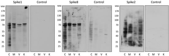 Cell membrane protein extracts from the different cell lines were prepared using the Qproteome Cell Compartment Kit (Qiagen, Hilden, Germany) according to the manufacturer’s instructions. The proteins in these extracts (around 100 µg per lane) were separated by 10% SDS-polyacrylamide gel electrophoresis (SDS-PAGE) and transferred to nitrocellulose membranes. The nitrocellulose membranes were blocked with 5% skim milk (Carnation, Solon, OH, USA) in PBS-0.1% Tween 20 for 1 h at room temperature, and after this time the membranes were incubated overnight at 4 °C with 100 µg/mL of the corresponding recombinant spike of HAstV serotypes 1, 2 or 8 in 1% skim milk prepared with PBS-0.1% Tween 20, and subsequently washed three times with PBS-0.1% Tween 20. Anti-spike mouse or rabbit polyclonal antibodies generated in our laboratory were added at a 1:1000 dilution and incubated for 1 h at RT. After washing the membranes three times with PBS-0.1% Tween 20, peroxidase-conjugated rabbit or mouse antibodies (KPL, Gaithersburg, MD, USA, dil. 1:3000) were added and incubated for 1 h at RT. Finally, the membranes were washed once and the presence of the astrovirus spike was detected by chemiluminescence using the Western Lightning system (Perkin Elmer, Waltham, MA, USA).