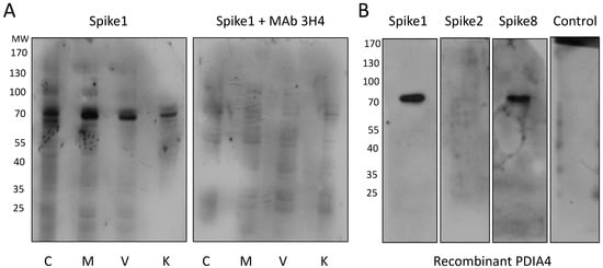 For the far-Western analysis, cell membrane-enriched protein extracts were prepared, separated by SDS-PAGE, and transferred to nitrocellulose membranes. The membranes were then incubated with the recombinant capsid spike protein of HAstV serotype 1, 2 or 8 (spike 1, 2 or 8). The corresponding spike protein was detected with polyclonal antibodies specifically raised to each of the three recombinant proteins [,]. Spikes 1 and 8 were found to interact consistently, and most prominently, with two cellular proteins that migrated in the range of 70 to 75 kDa, while in the control lanes, incubated only with the anti-spike antibody in the absence of the spike proteins, these bands were not observed (Figure 2). Although slight variations in the electrophoretic migration of these two bands were observed in the different cell lines, they were identified in all cells tested (permissive, semi-permissive and non-permissive). Of interest, spike 2 does not seem to interact with the 70–75 kDa proteins recognized by the spike proteins of serotypes 1 and 8, suggesting that HAstV-2 might recognize different molecules on the cell surface. In these assays, several bands of lower molecular weight, not present in the control conditions, were observed when the cell membrane extracts were incubated with either of the three spikes. The presence of these bands was not reproducible in different experiments, although a potential role of some of these proteins in the interaction of the viruses with the cell surface cannot be discarded. Interestingly, when the spike 1 protein was pre-incubated with the neutralizing MAb 3H4, which inhibits the binding of HAstV-1 to the cell surface (unpublished data), its binding to the 70–75 kDa bands was clearly abolished (Figure 3A).