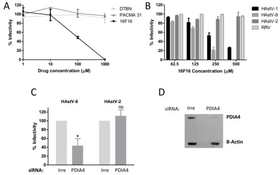 To explore the role of PDIA4 in viral infection, Caco-2 cells were pre-treated for 1 h at 37 °C with different pharmacological PDI inhibitors that target the cysteines at the active site of the enzyme. Following infection with HAstV-8, the effect of the PDI inhibitors on viral infectivity was determined by an immunoperoxidase assay as previously described []. Of the 3 inhibitors tested (DTNB, 16F16 and PACMA31) only 16F16, a cell permeable inhibitor that had been reported to inhibit the enzymatic activity of PDIA4 [], showed an inhibitory effect on HAstV-8 infection (Figure 4A). HAstV-1 was also affected by this drug, with a 75% reduction of infectivity at 500 µM, while the infectivity of HAstV-2 was not affected by this drug (Figure 4B). As a control we also tested the effect of 16F16 on a rhesus rotavirus (RRV) strain; the infectivity of this virus was not decreased in the presence of the inhibitor (Figure 4B), indicating that the effect is virus-specific as well as HAstV serotype-specific. The viability of the cells, as determined by an LDH assay, was not affected, even at the highest concentrations tested (data not shown). Furthermore, knocking-down the expression of PDIA4 in Caco-2 cells by transfection with a pool of specific siRNAs directed to its mRNA (Figure 4D) reduced the infectivity of HAstV-8 by about 60% as compared to a control transfection with an irrelevant scrambled siRNA, indicating the involvement of PDIA4 in the infection of this virus (Figure 4C); on the other hand, as expected, the infectivity of HAstV-2 was not affected by the siRNAs. Altogether, these findings suggest that the activity of PDIA4 is relevant for HAstV-1 and -8 infection, but not for HAstV-2, consistent with the results obtained in the far-Western assays.