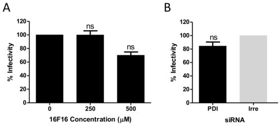Considering the previous results, we tested whether the PDI activity could be required for the final step of the virus entry process, i.e., uncoating of the viral genome that occurs when the virus in the endocytic vesicle liberates the viral genetic material into the cytoplasm. For this, a neutral red-based RNA release assay was carried out, as described []. This assay is based on the capacity of the dye to be incorporated into the viral particles during replication of the virus. The proximity of neutral red to the viral RNA makes the virus infectivity sensitive to exposure to light; however, once the genomic RNA is released into the cytoplasm, the dye diffuses out and the infection can take place in the light []. Based on this premise, we prepared a virus stock by infecting Caco-2 cells in the presence of neutral red, in the dark, which was then used to infect 16F16-treated or untreated Caco-2 cells in the dark for 2 h at 37 °C to allow the virus to be internalized. After this time the cells were removed from the dark and the infection was left to proceed for 16 h at 37 °C under regular white light conditions. The infectivity was determined 16 h post-infection by an immunoperoxidase assay. If virus uncoating is affected in the presence of 16F16, the viral infectivity would be reduced when the drug-treated cells are exposed to light after the internalization process has occurred. Of interest, the infectivity of HAstV-8 was decreased by about 80% under these conditions at 500 µM 16F16 (Figure 6), strongly suggesting that the activity of PDI facilitates the exit of the virus from the endocytic vesicle and the release of the viral genome into the host cytoplasm.