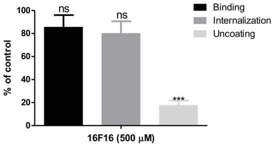 Since attachment of the virus to the cell surface was not affected under conditions that greatly reduce HAstV-8 infectivity, we evaluated if internalization of the virus particles was perturbed in the presence of the drug. For this, Caco-2 cells were treated with 500 µM 16F16 for 1 h at room temperature, and HAstV-8 at an MOI of 50 was adsorbed to the cell surface for 1 h at 4 °C. After this time, the cells were shifted to 37 °C for 1 h to allow the bound virus to be endocytosed, and the non-internalized virus was removed from the cell surface by further incubation of the cells for 1 h at 4 °C with MAb 2D9 directed to HAstV-8, which has been shown to detach 80% of the surface-adsorbed virus under these conditions (unpublished data). The internalized viruses were then quantified by qRT-PCR. No effect on virus internalization was detected by treatment of cells with 16F16 when compared to untreated, control cells (Figure 6).
