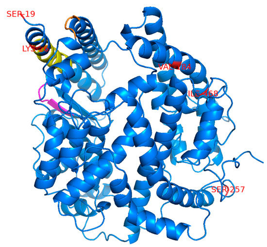 Mapping of the amino acid residues corresponding to the selected SNPs used in this study. The positions of the amino acid residues corresponding to the selected SNPs are marked in red on the crystal structure of ACE2 (1R42). Three amino acid positions (N637, L656, and N720) are not shown here because the regions containing these amino acids are not present in this crystal structure. The three separate regions reported to be important for binding to SARS-CoV-S are colored in yellow, magenta, and orange.