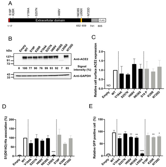 HEK293T cells seeded in a 12-well plate at 4 × 105 cells per well and cultured overnight were transfected with 0.2 μg of plasmids expressing WT ACE2 or the ACE2 variants using 0.5 uL of Lipofectamine 2000. At 24 h posttransfection, the transfected cells were collected, mixed with 1.5 µg of the recombinant SARS-CoV-2 S1 subunit containing the D614G mutation fused with the His-tag (Sino Biological), and incubated on ice for 1 h. S1-bound cells were washed with 0.5% bovine serum albumin (BSA) in PBS and incubated for another 30 min on ice with anti-His-tag mouse monoclonal antibody conjugated with Alexa Fluor 488 (D291-A48; MBL) and 7-aminoactinomycin D (7-AAD; Invitrogen) for the detection of dead cells. Cells were then washed with 0.5% BSA in PBS and subjected to flow cytometry analysis with the SH800S Cell Sorter (Sony, Tokyo, Japan) to determine the proportions of live and S1-binding cells.