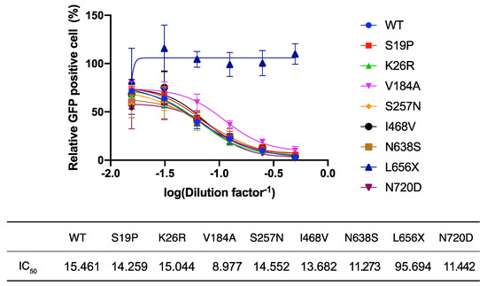 L656 is located within the cleavage site of the disintegrin and metalloproteinase domain-containing protein 17 (ADAM17). Recent reports indicate that ACE2 cleaved by ADAM17 is released into the extracellular space [24] and this soluble form of ACE2 interacts with SARS-2-S on cell-free SARS-CoV-2 virions, leading to the inhibition of viral infection [25]. These findings and the very low intracellular levels of ACE2(L656X) observed in the present study (Figure 2B) led us to explore the possibility that the L656X mutation promoted rapid ACE2 secretion, resulting in barely detectable intracellular levels of ACE2(L656X) and high levels of shedded ACE2(L656X) that could strongly inhibit SARS-CoV-2 infection. To investigate this possibility, we examined the capacity of the ACE2 variants for shedding into the extracellular space and the subsequent neutralization of viral entry mediated by SARS-2-S. For this purpose, rVSV∆G-GFP/SARS-2-S(D614G) was pre-incubated with serially diluted TCS from HEK293T cells transfected with plasmids expressing WT ACE2 or the ACE2 variants and then inoculated into HEK293T/ACE2 cell cultures. Virally infected (GFP+) cell numbers were determined with a high-content imaging system (Figure 3). Unexpectedly, the TCS from cells transfected with the ACE2(L656X) expression plasmid showed no inhibitory effect on SARS-2-S-mediated cell entry, whereas the other ACE2 variants shedded into the TCS did inhibit rVSV∆G-GFP/SARS-2-S(D614G) infection with an efficiency similar to that of WT ACE2 (Figure 3). These results indicate that L656 is essential for ACE2 expression and ACE2 may need to be cleaved by ADAM17 on the cellular membrane to shed soluble ACE2 and inhibit SARS-CoV-2 infection. Intriguingly, the ACE2 gene is encoded on the X chromosome, and therefore, our results for ACE2(L656X) imply that a male with an L656X SNP would be naturally resistant to SARS-CoV-2.